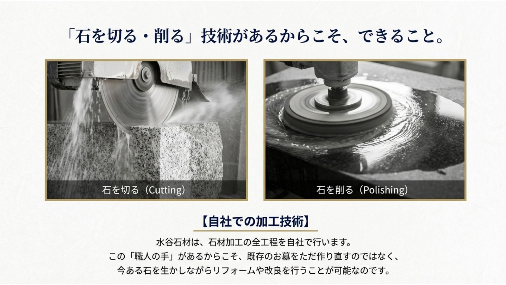 私たちは、職人が直接石を削り、加工する技術を大切にしています。だからこそ、決まった形を売るのではなく、お客様の「今の悩み」に合わせたリフォームが得意です。